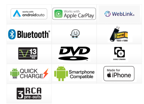 | FORMATOS Y CONEXIONES | Full HD video, BT, USB, MP3, WAV, FLAC | BT, USB, MP3, WAV, FLAC, TV Digital | DVD, DivX, CD, MP3, WMA, AAC, FLAC, WAV, JPEG, WebLink, TV Digital | BT, CD, USB, MP3, WAV, FLAC |